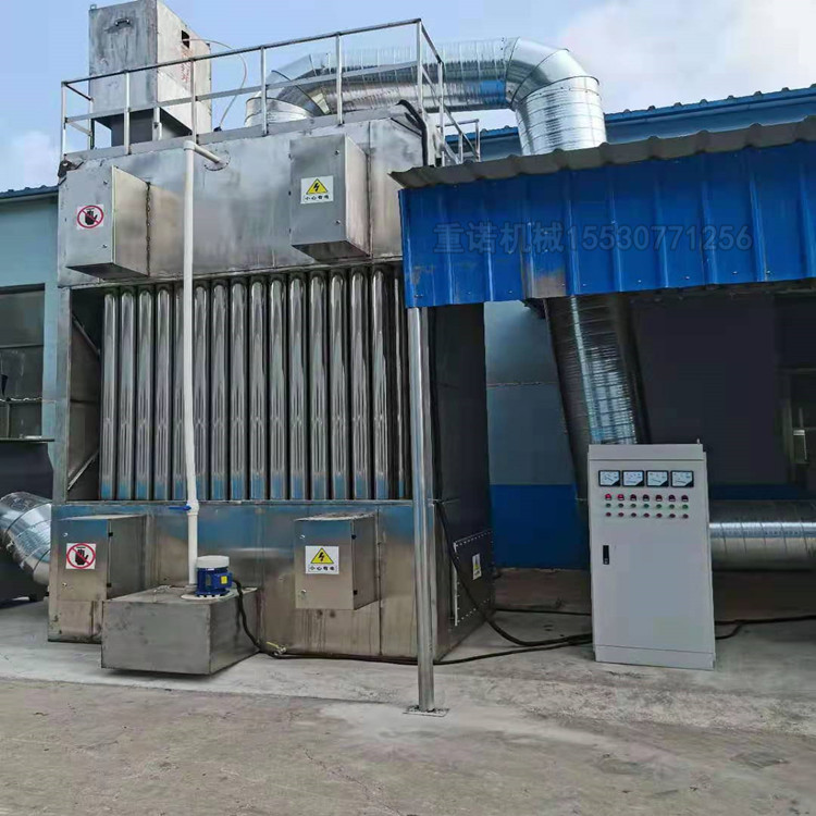 二、脉冲除尘器的工作原理:主要由上箱、中箱、灰斗、进气均压管、支撑滤袋及喷射装置、卸灰装置等组成,含尘气体从除尘器进气均压管进入各仓灰斗。在灰斗导向装置的引导下,大颗粒粉尘分离后直接落入灰斗,细颗粒粉尘均匀进入中间箱体,吸附在滤袋外表面,洁净气体渗透滤袋进入上箱体。并通过各离线阀和排气管排入大气。随着过滤条件的改善,滤袋上的粉尘会越来越多地积聚起来。当设备电阻达到*限电阻值(一般设定为1500pa)时,除尘控制装置根据压差整定值或除尘时间整定值自彻