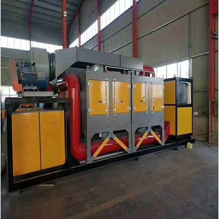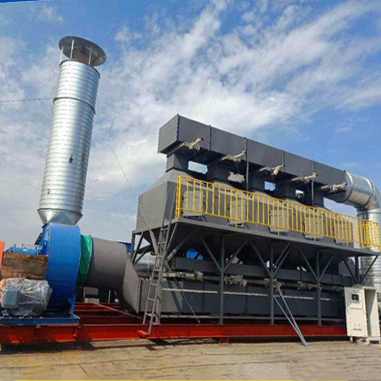 在化学反应过程中,利用催化剂降低燃烧温度,加速有毒有害气体完全氧化的方法,叫做催化燃烧法。由于催化剂的载体是由多孔材料制作的,具有较大的比表面积和合适的孔径,当加热到300~450℃的有机气体通过催化层时,氧和有机气体被吸附在多孔材料表层的催化剂上,增加了氧和有机气体接触碰撞的机会,提高了活性,使有机气体与氧产生剧烈的化学反应而生成CO2和H2O,同时产生热量,从而使得有机气体变成无毒无害气体。