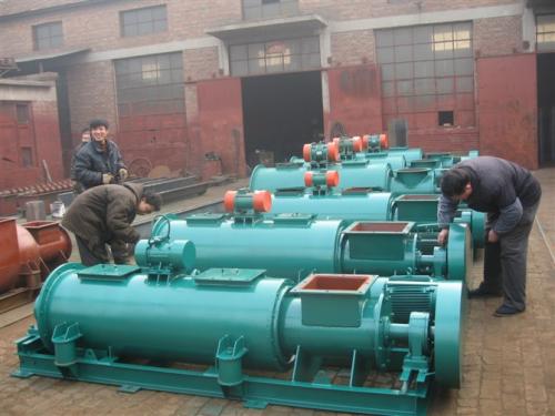 单轴粉尘搅拌加湿机由均匀供料、叶片输料、混合击打加湿,振动系统等四部分组成,并配以专用电控和供水系统。该设备整体固定在底座上,筒体由四组弹性元件支撑,通过激振装置,施以震动,使整机在运转过程中,筒体作高频振动,使筒壁与搅拌轴之间始终保持一定的间隙,使整机运转阻力大幅度减小,彻底杜*了闷机,堵转现象,减小停机清理时间,提高了工作效率。供水由阀门组进行控制。为稳定本系统供水及清洁水质,管路中设置了过滤器,并由主控柜对加湿机各部分进行联锁控制,以达到控制供水恒湿运行的目的。搅拌加湿机具有处理量大、结构紧凑、技术、稳定可靠、维修简单等特点。单轴粉尘加湿搅拌机经常适用于各类灰库干灰进行喷水加湿搅拌及输送粉状,以达到环保外运的要求。广泛应用于化工、矿山、电厂、钢厂等含固体颗粒物料的加湿、搅拌和输送。单轴螺旋输送机1.出力大(每小时可搅拌加湿200t),加湿均匀,工作可靠。2.特制的雾化喷嘴及水量可调的给水系统,可保证物料加湿均匀。3.增加振动系统,使之克服了其处理粘性粉尘易形成筒壁粘结的问题,提高了加湿机的适应性,扩大了加湿机的应用范围。且壳体与底座采用弹性联接,使振打对整机无影响。4.搅拌棒采用铁基耐磨合金或复合陶瓷制造,使用寿命长 5.壳体内衬采用铁基耐磨合金制造,使用寿命高,避免间隙过大引起的物料自流。6.本机布置灵活,有链传动和直联两种形式,传动机构采用摆线式减速机。